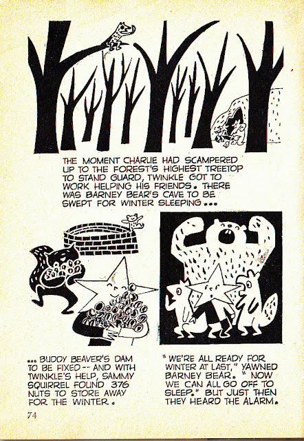 But Twinkle -- Twinkle has been forgotten. A six page Twinkle story was in most issues of HD, back in the day. Here's my earliest copy, from 1957, that I got from eBay this week. The feature alternately intrigued me and terrified me when I was a tot. I mean, look at those trees: leafless, bare of most branches. The woodcut approach was none too cuddly in my little kid eyes.